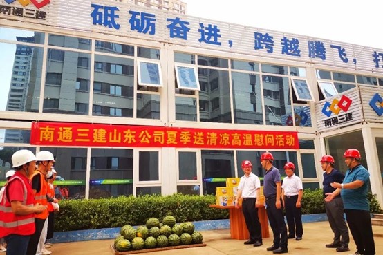 山东公司组织开展夏季送清凉高温慰问活动,深入青岛、济南项目,详细了解高温期间工人作业和生活情况,对他们顶烈日、战酷暑推进项目建设表示感谢,并送去防暑降温用品,叮嘱工人们劳逸结合、安全第一。同时,山东公司要求各个项目管理团队密切关注高温天气情况,实行“抓两头、歇中间”的避暑措施,适当调整作息时间,在施工现场和宿舍区落实好各项防暑降温措施,抓牢疫情防控和食堂食品卫生安全不松懈,确保施工作业人员和管理人员身心健康。